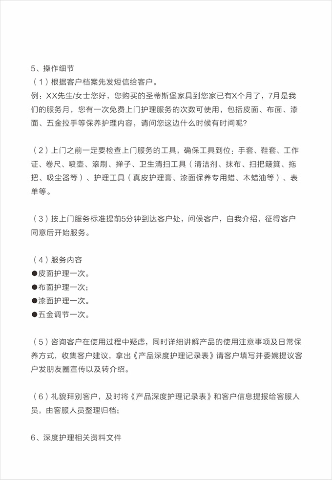 話術(shù)參考:“**先生/女士您好,我是圣蒂斯堡的售后服務(wù)人員**,您購買的圣蒂斯堡家具已經(jīng)全部到貨了,送貨安裝大約需要**時(shí)間,請問您這邊什么時(shí)候方便我們上門送貨安裝呢?”同時(shí)要了解送貨小區(qū)的電梯、樓道、入戶門的尺寸等,提前做好準(zhǔn)備,避免意外情況。最后確定送貨時(shí)間(安裝所需要時(shí)長),并告知客戶安裝人員的相關(guān)信息,可加微信發(fā)送,并發(fā)送配送安裝流程說明。