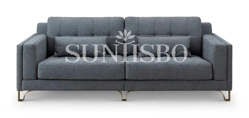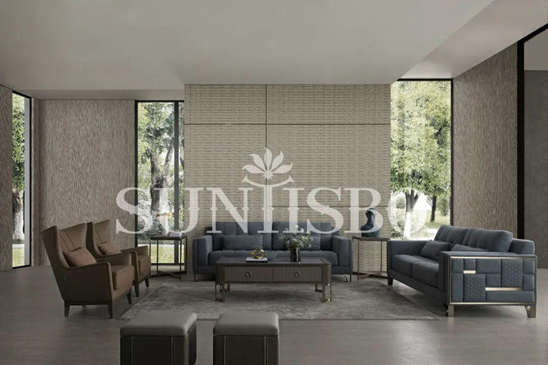 沙發(fā)采用細(xì)膩的顆粒感皮料,不僅增加了霧霾藍(lán)色彩的飽和度,也在視覺上充實(shí)了空間的安全感。輪廓,扶手皆為干練利落的直線,放眼望去不僅簡化了空間,也傳達(dá)著對(duì)精簡生活的追求。