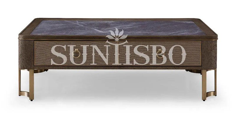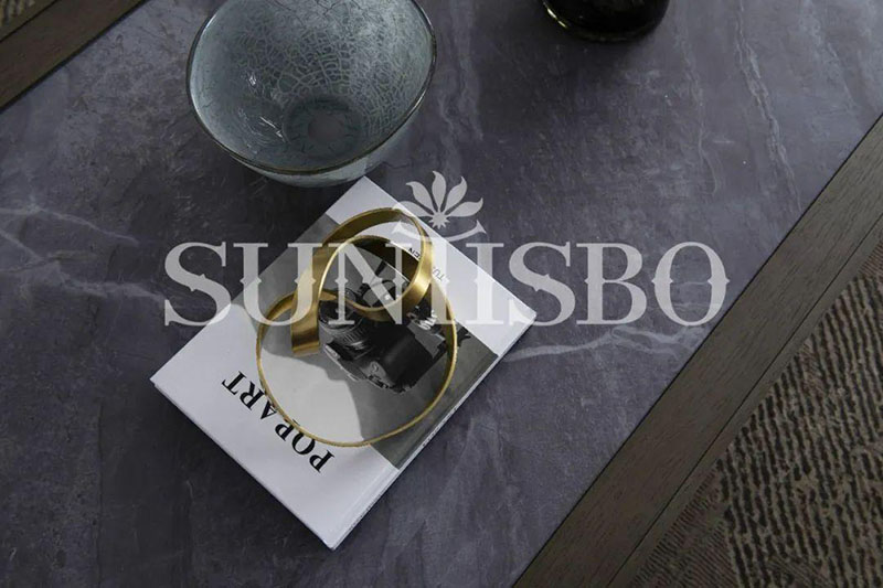 茶幾桌面采用仿巖板質(zhì)感的巖玻,既保留了鋼化玻璃的超強(qiáng)硬度,同時(shí)擁有玻璃的通透感與巖板紋理的現(xiàn)代感。玻璃與巖板產(chǎn)生的撞色,提升了空間的氣韻。