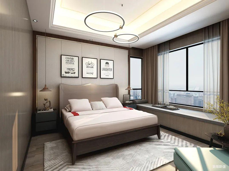 臥室精簡有致,從質(zhì)感出發(fā),打造由內(nèi)而外的優(yōu)雅奢華感。背景墻、地板、地毯均擁有較強的肌理感,在加上金屬軟裝飾物調(diào)和,讓空間在低調(diào)內(nèi)斂的基礎(chǔ)上又不失時尚的高級感,飄窗進階為溫馨的一角,閑暇時,則可倚窗而坐,品一杯紅酒,感受生活中的愜意時光。