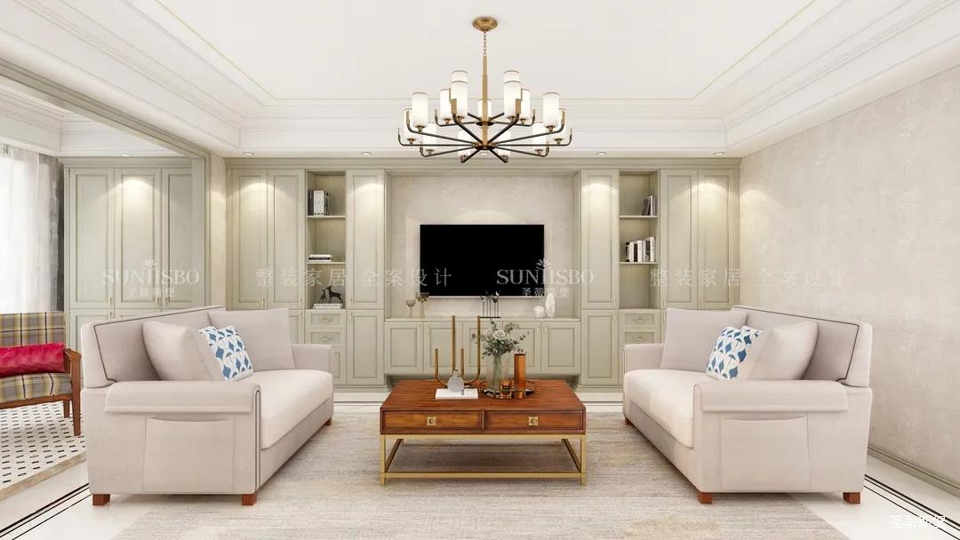 它以英倫爵士灰為柜體主調(diào),背景墻定制了整墻的儲(chǔ)物柜,色調(diào)懷舊復(fù)古的同時(shí)還夾帶著時(shí)尚摩登氣息,明暗收納合理分區(qū),電視被實(shí)木飾面包圍,使空間視覺得以延伸,美觀收納兩不誤。
