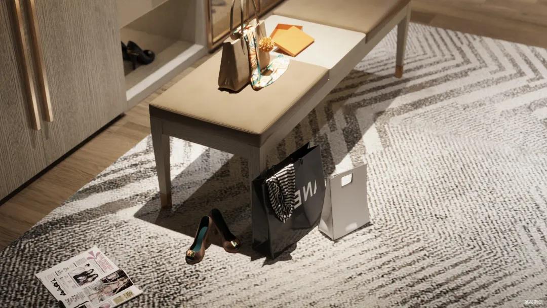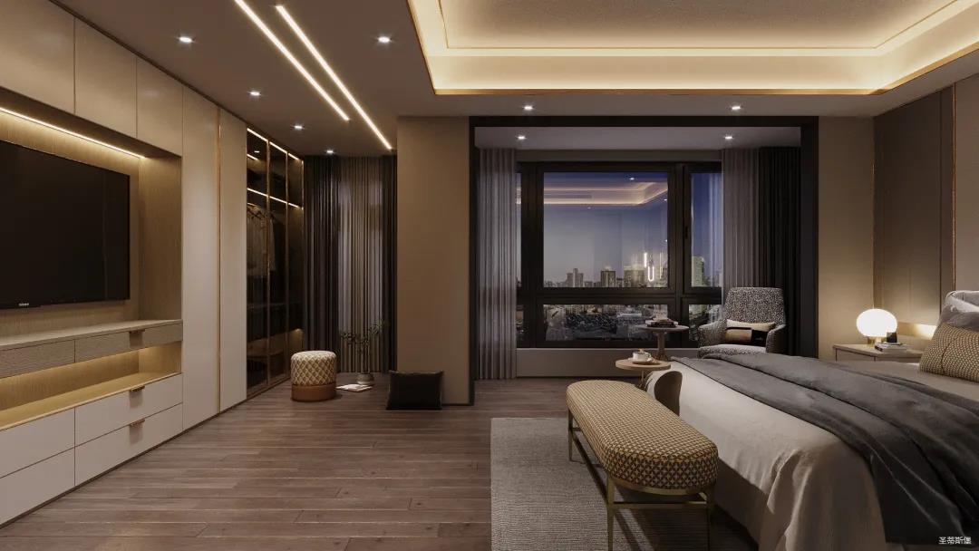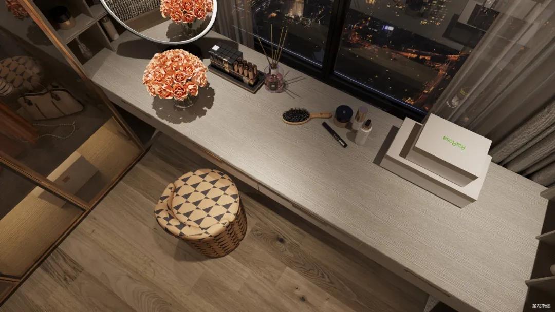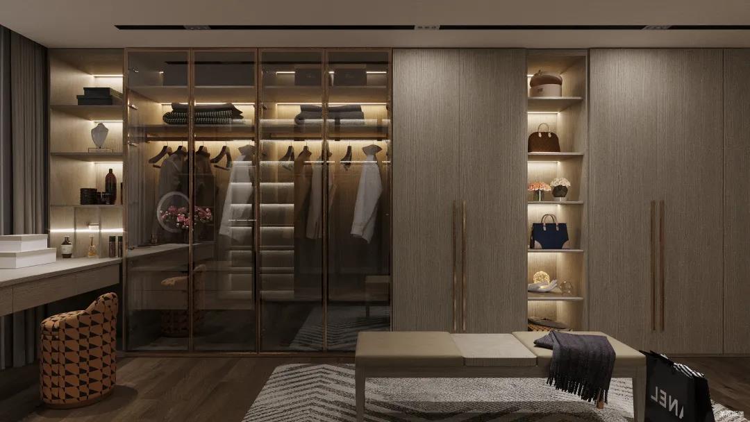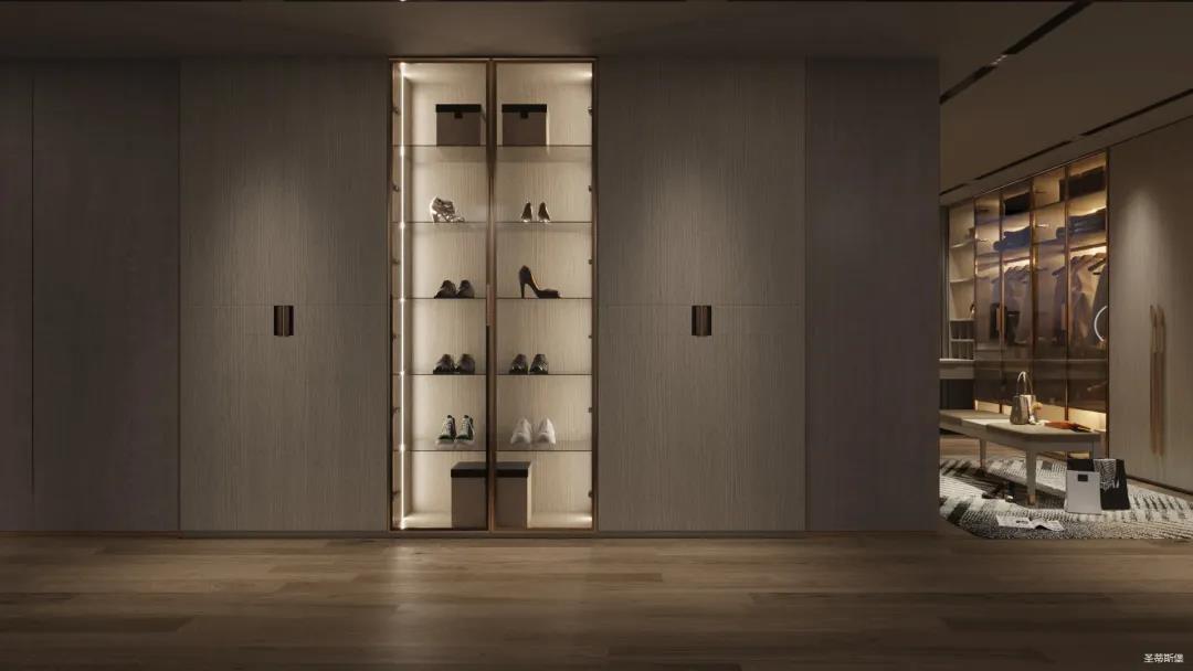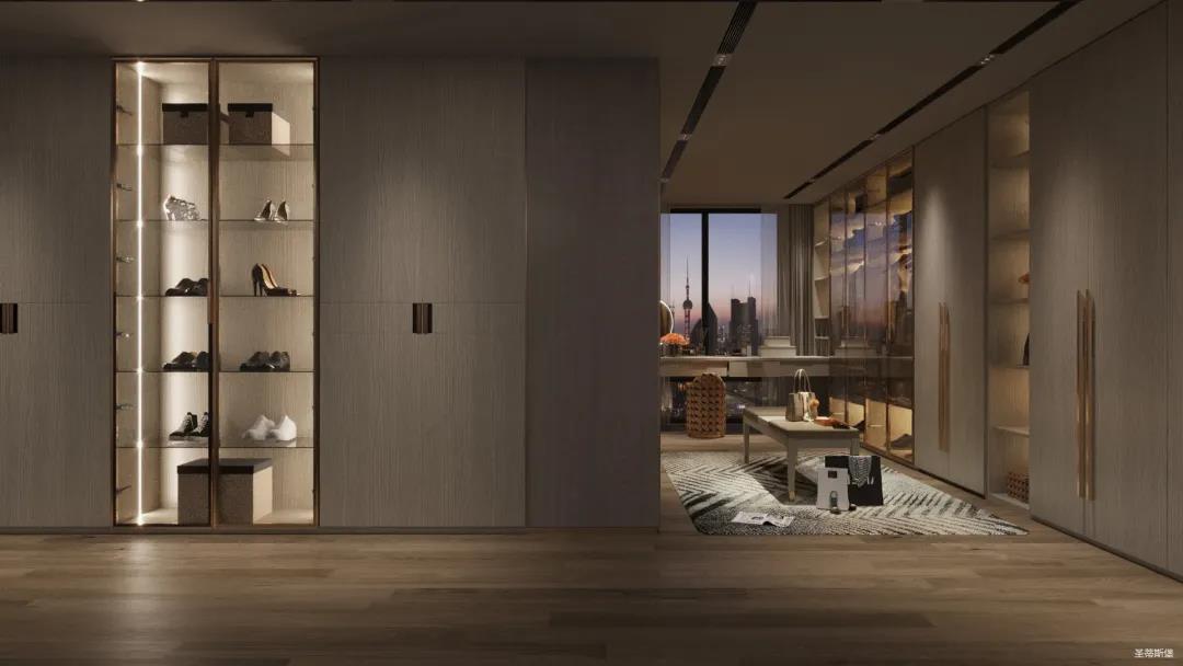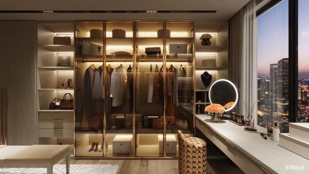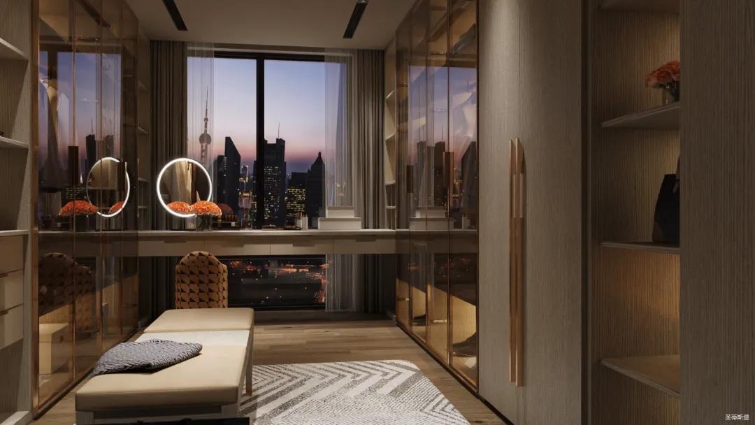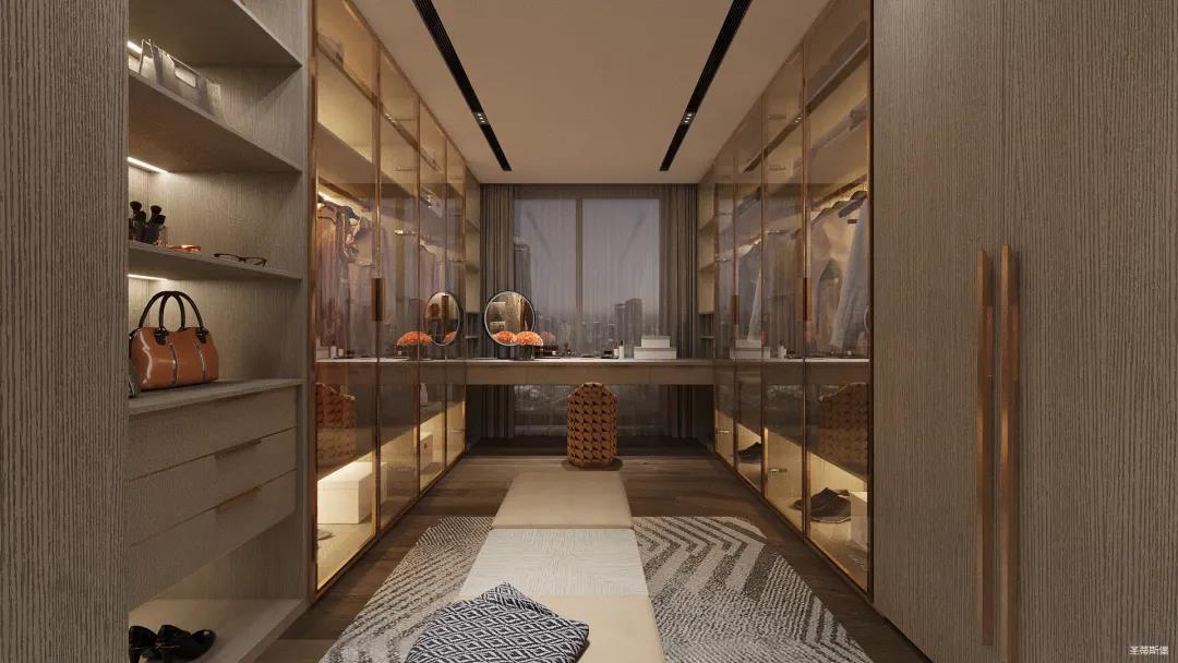 移步衣帽間,精簡(jiǎn)華麗幾乎貫穿了整個(gè)空間,質(zhì)感高級(jí)的實(shí)木定制柜框架、通透明亮的玻璃展示區(qū)、色調(diào)醇厚的金屬鑲邊,每一項(xiàng)細(xì)節(jié)搭配都在強(qiáng)調(diào)著業(yè)主的高端品位。妝臺(tái)前的落地窗讓我們?cè)谟^賞都市繁華的同時(shí)也屏蔽了都市喧囂,讓我們置身于繁華都市中有一處寧靜休憩地。