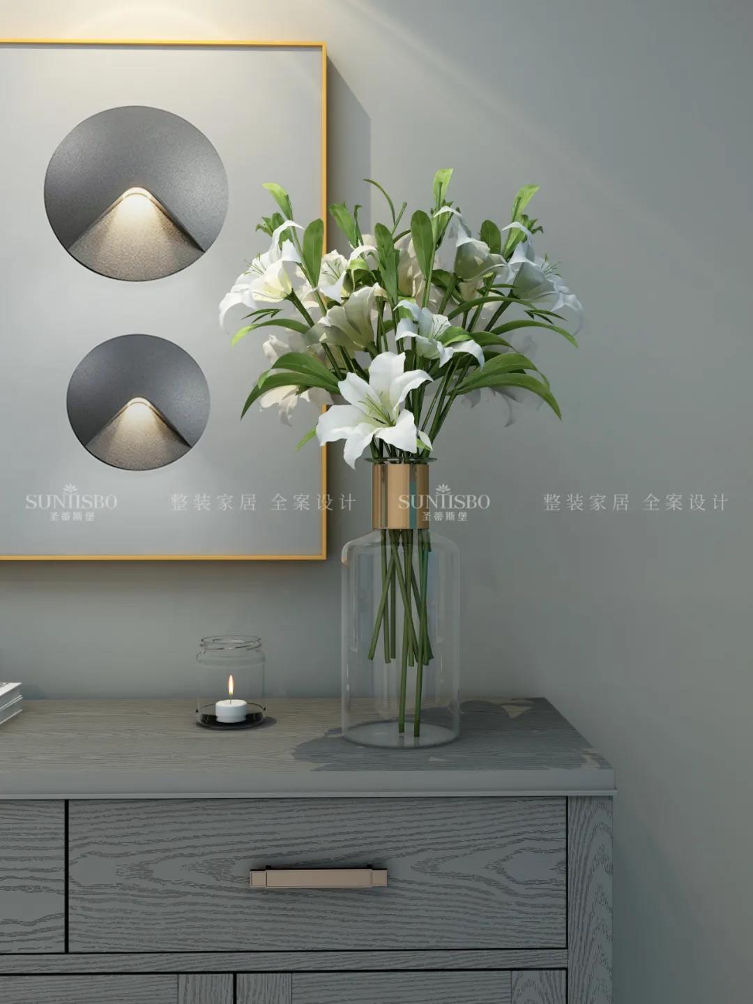 入戶側(cè)面設(shè)計一字型玄關(guān),腰部,底部留空做層板,便于隨手放置鑰匙、鞋包等物品,中間留空設(shè)計為開放展示區(qū),加上軟裝飾品點綴,達(dá)到業(yè)主對品質(zhì)生活追求的理想狀態(tài)。應(yīng)女主人要求,玄關(guān)還加長延伸出妝鏡和換鞋凳,讓動線自然流暢。