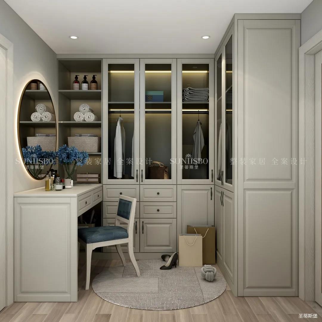 利用主臥多出來的小空間,設(shè)計打造出步入式衣帽間。定制了L型的轉(zhuǎn)角衣柜,提供了超強的收納空間。圓形的裝飾地毯與妝鏡相呼應(yīng),彰顯著空間女主人對精致生活的態(tài)度。